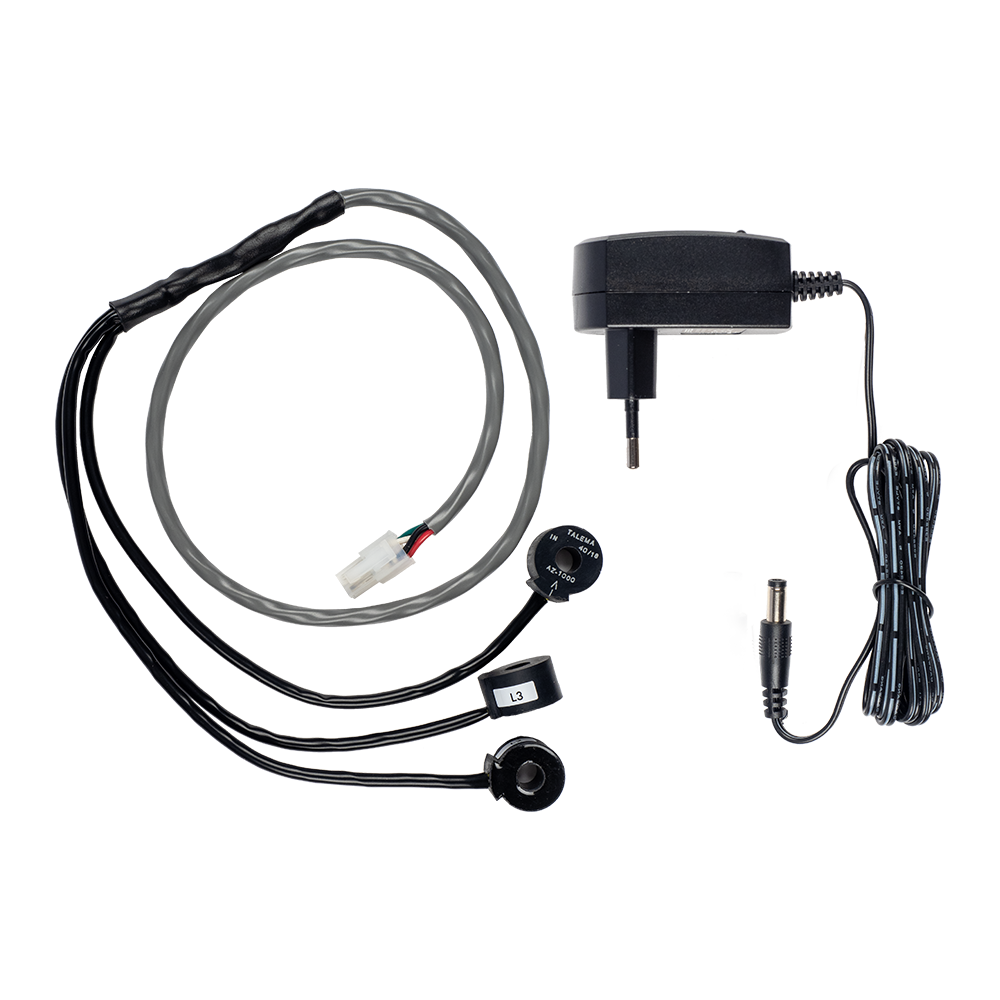 Set van 3 stroomtransformatoren, maximaal 3-fase 40A indien geen slimme kWh-meter met P1-poort. VD max. 10 mm, 12V power adapter.